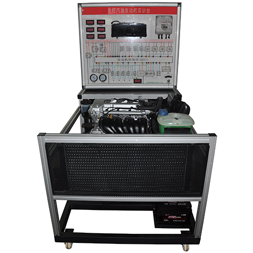 采用丰田卡罗拉发动机系统总成为基础,包含所有的传感器、执行器、供油系统、散热系统、电源系统、进排气系统、油门操纵机构等组成;面板设有组合仪表、控制电脑ECU、点火开关、故障诊断座、进气真空压力表、燃油压力表、传感器参数显示与检测数字表、喷油频率LED显示灯;